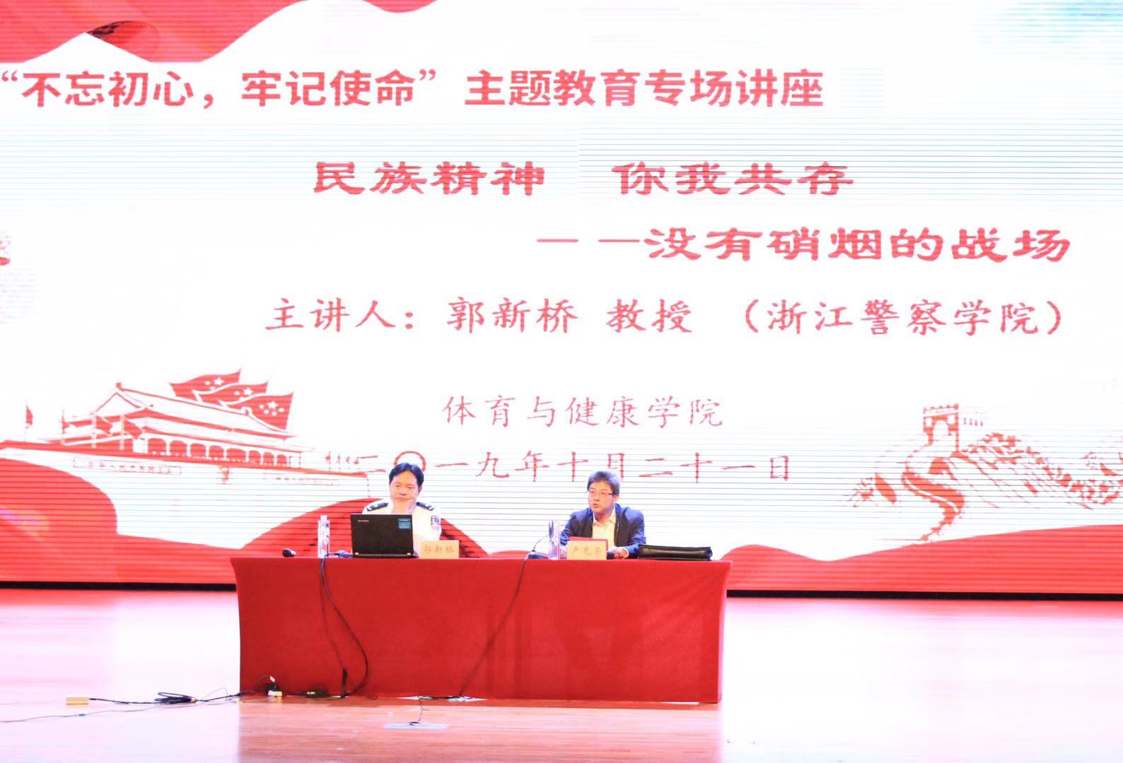 为扎实推进“不忘初心,牢记使命”主题教育,进一步加强爱国主义教育,恰逢第七届世界军人运动会隆重举行,体育学院特邀浙江警察学院郭新桥教授开展“民族精神,你我共存——没有硝烟的战场”爱国主义主题讲座。