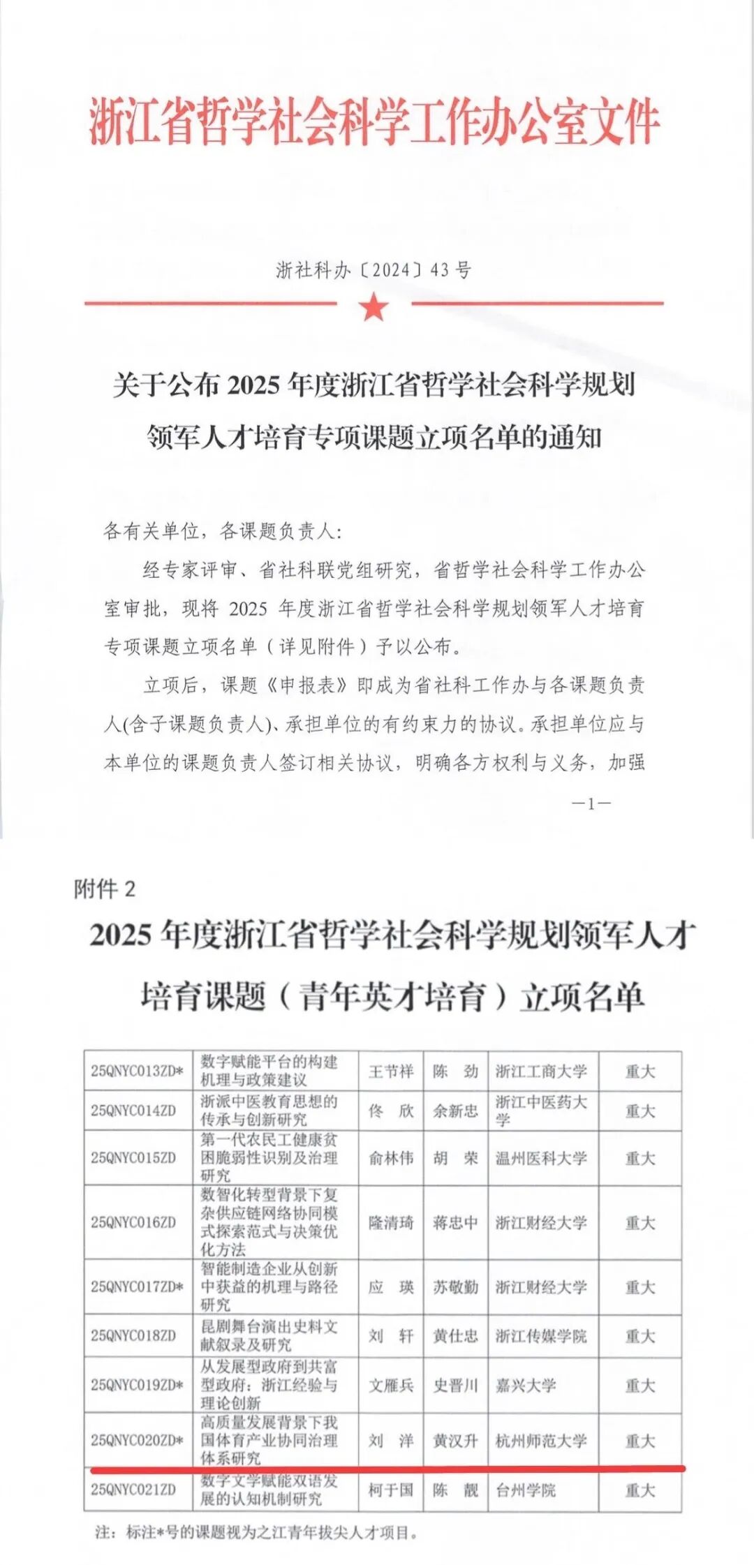 近日,2025年度浙江省哲学社会科学规划领军人才培育专项课题立项名单公布。我院刘洋教授“高质量发展背景下我国体育产业协同治理体系研究”获青年英才培育重大项目立项。
