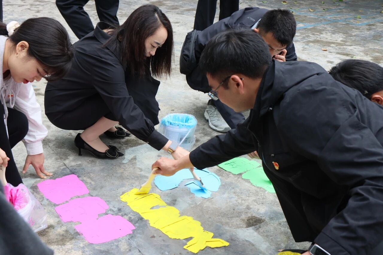 与此同时,操场另一侧的彩绘活动也在如火如荼地展开,水泥地变身“运动乐园”成为全场亮点。新宅镇中心小学校长钟献祥、学院党委副书记张金玲等领导手握画笔,为孩子们共同绘制跳房子、投篮区等图案。斑斓的地面不仅装点校园,更让课间活动充满创意与欢笑,传递出党建联建的温暖与关怀。