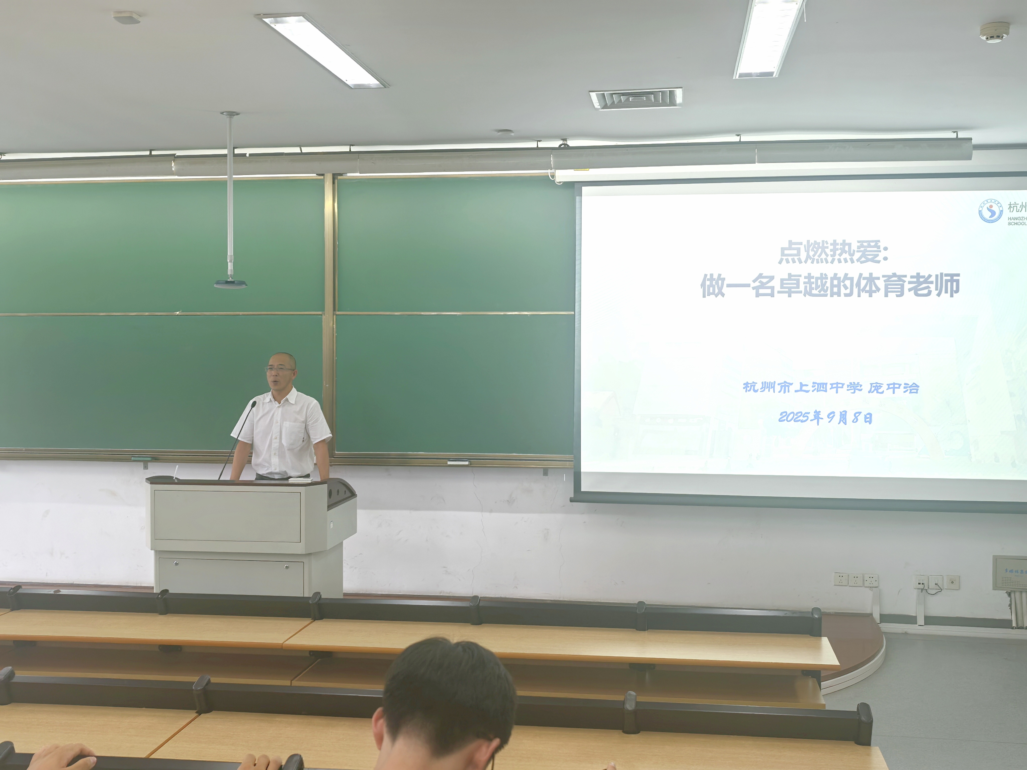 随着新学期开始,2022级同学进入了实习强化周阶段。 2025年9月8日下午,应学院邀请,杭州市上泗中学庞中治书记,给杭州师范大学体育学院带来一场主题为“点燃热爱,做一名卓越的体育老师”的专题讲座,2022级体育教育和武术与民族传统体育专业本科生共计200人,学院副院长张磊老师,体育专业部主任张腾老师、武术与民族传统体育专业部主任王晓燕老师,以及部分专业部老师参加了本次讲座。