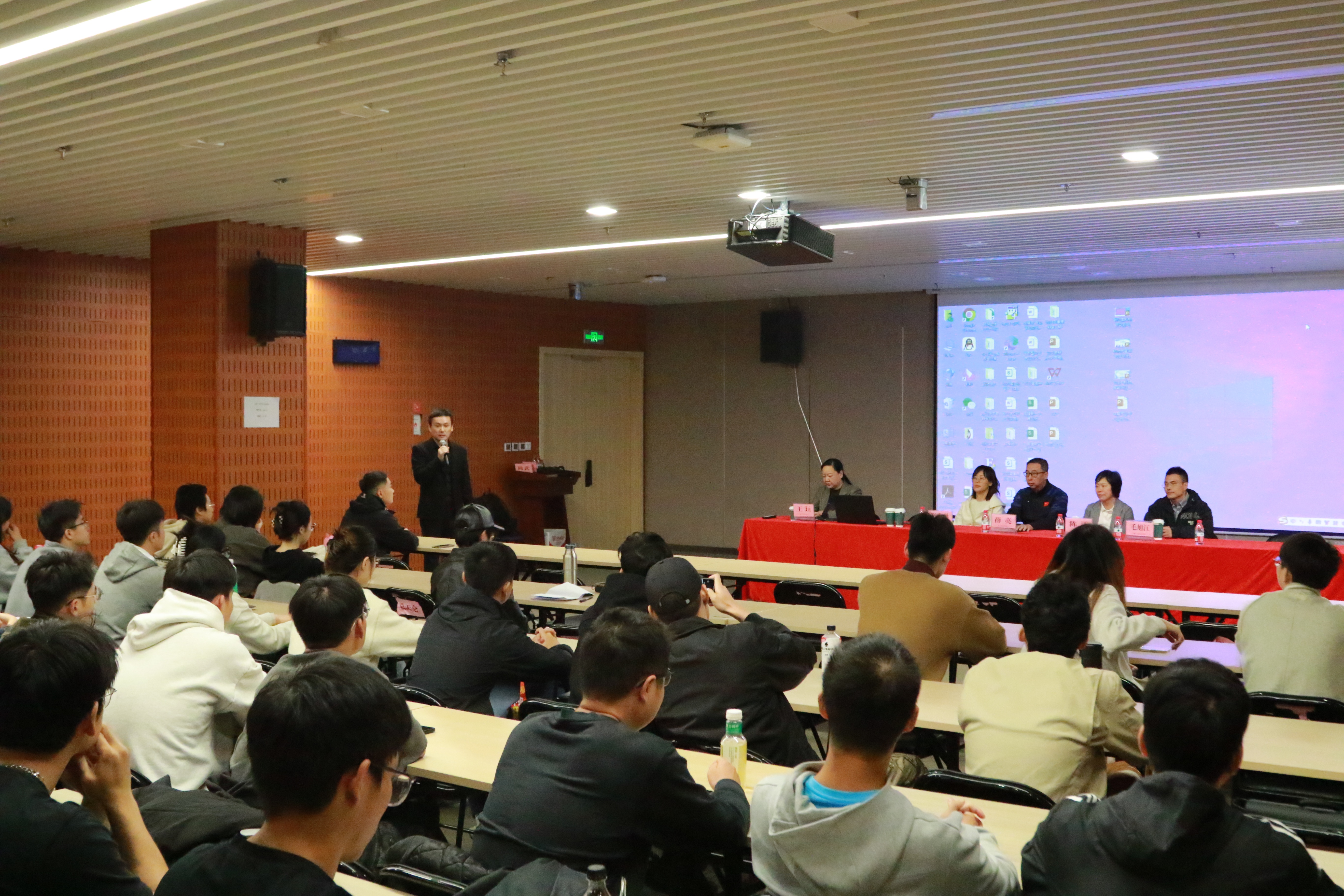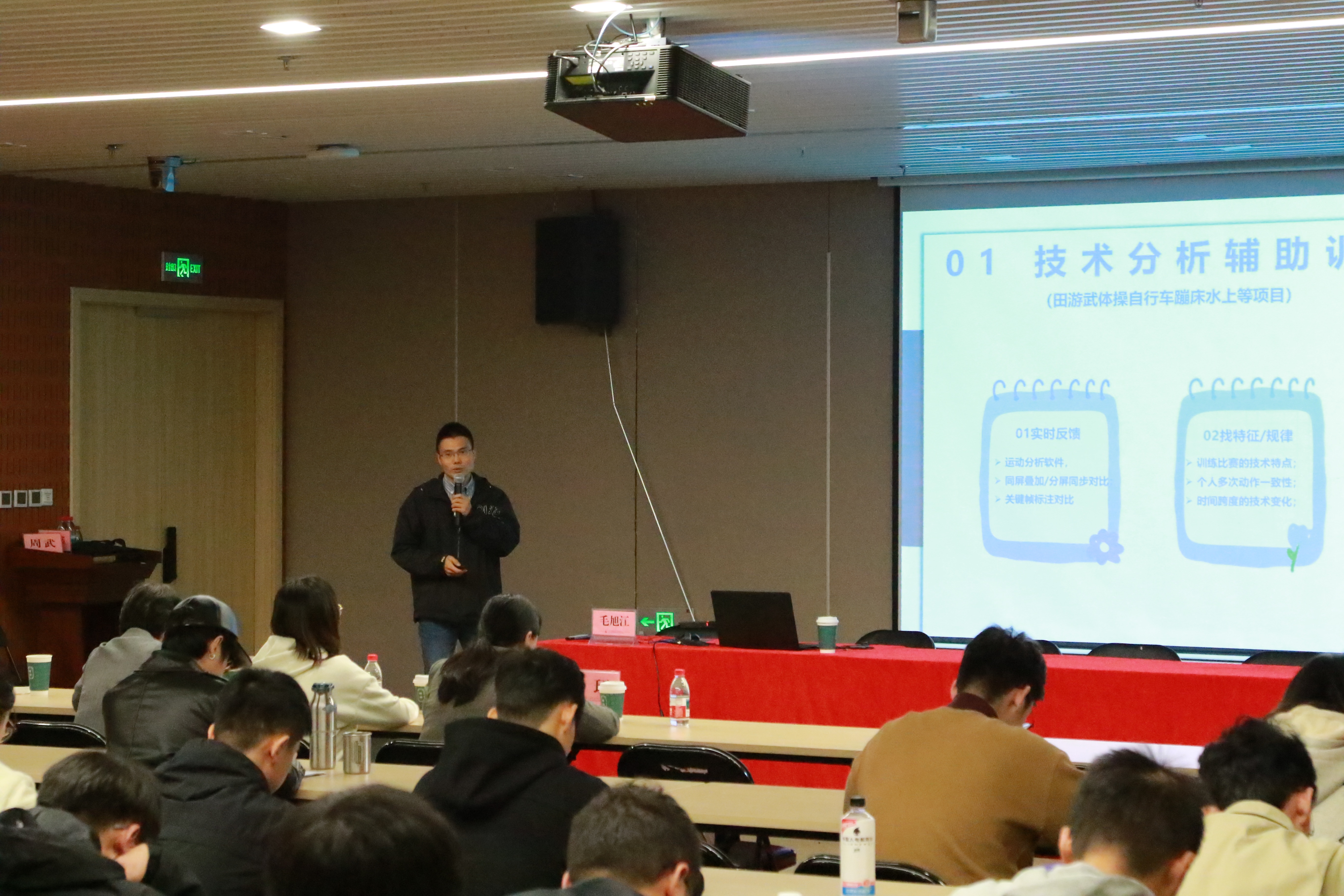在陈谦副所长之后,宣讲团成员依次带来精彩分享。全民健身研究中心主任薛亮以“体育科技赋能全民健康的实施路径与实践”为题,将目光聚焦在国民体质监测与健康促进上,结合实际案例讲解了体育科技如何为大众健康保驾护航。体育产业研究中心主任陈文聪则围绕“浙江体育软实力提升”“环浙步道建设推进”等浙江体育领域的重点工作,介绍了省体科所在赛事强省建设、体育标准化推进等方面的探索与成果。全民健身研究中心的毛旭江老师,通过竞技体育与全民健身相关工作实践介绍,清晰阐述了体质测评与运动健康之间的紧密关联,为师生们搭建起理论与实践的桥梁。竞技体育研究中心副主任高伟栋则用生动的语言,分享了竞技体育科研人员的日常工作状态,让大家了解到科研工作者在赛场背后的默默付出。