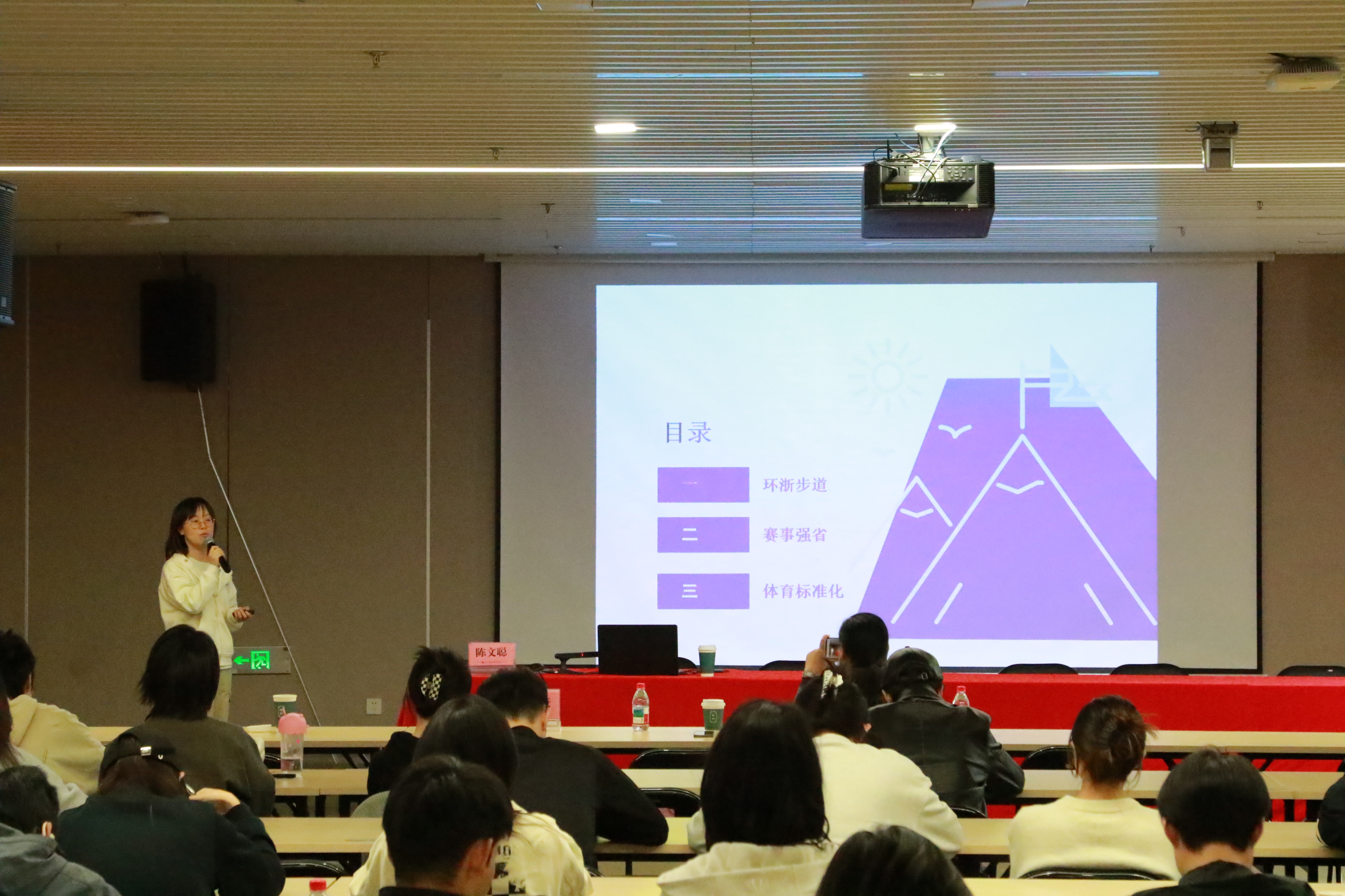 宣讲团由省体科所副所长陈谦亲自带队,开场时,她先向师生们介绍了宣讲团队的成员构成,随后详细讲解了省体科所的发展历程与整体概况。作为浙江省体育局下属唯一的省级体育科研机构,省体科所自1983年成立以来,始终在体育科研领域发挥着重要作用。2012年,机构又增挂了省反兴奋剂中心的牌子,进一步拓展了工作范畴。宣讲中,陈所以“科技助力体育领域的工作实践”为主题,深入解读了竞技体育科研保障、个性化备战服务等核心工作内容,这些工作已覆盖射击、自行车等多个重点体育项目,让在场师生对体育科研的实际应用有了更直观的认识。