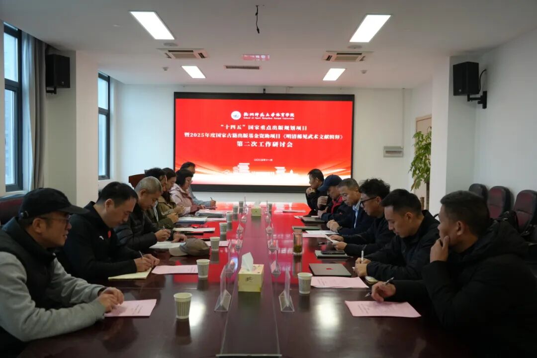 11月17日,“十四五”国家重点出版规划项目、2025年国家古籍出版基金资助项目《明清稀见武术文献辑释》第二次工作研讨会在我院顺利举行。北京体育大学出版社、杭州师范大学及项目编委会的相关领导、专家学者齐聚一堂,围绕项目推进中的关键问题展开深入研讨,凝聚共识共促项目高质量发展。会议由张磊副院长主持。
