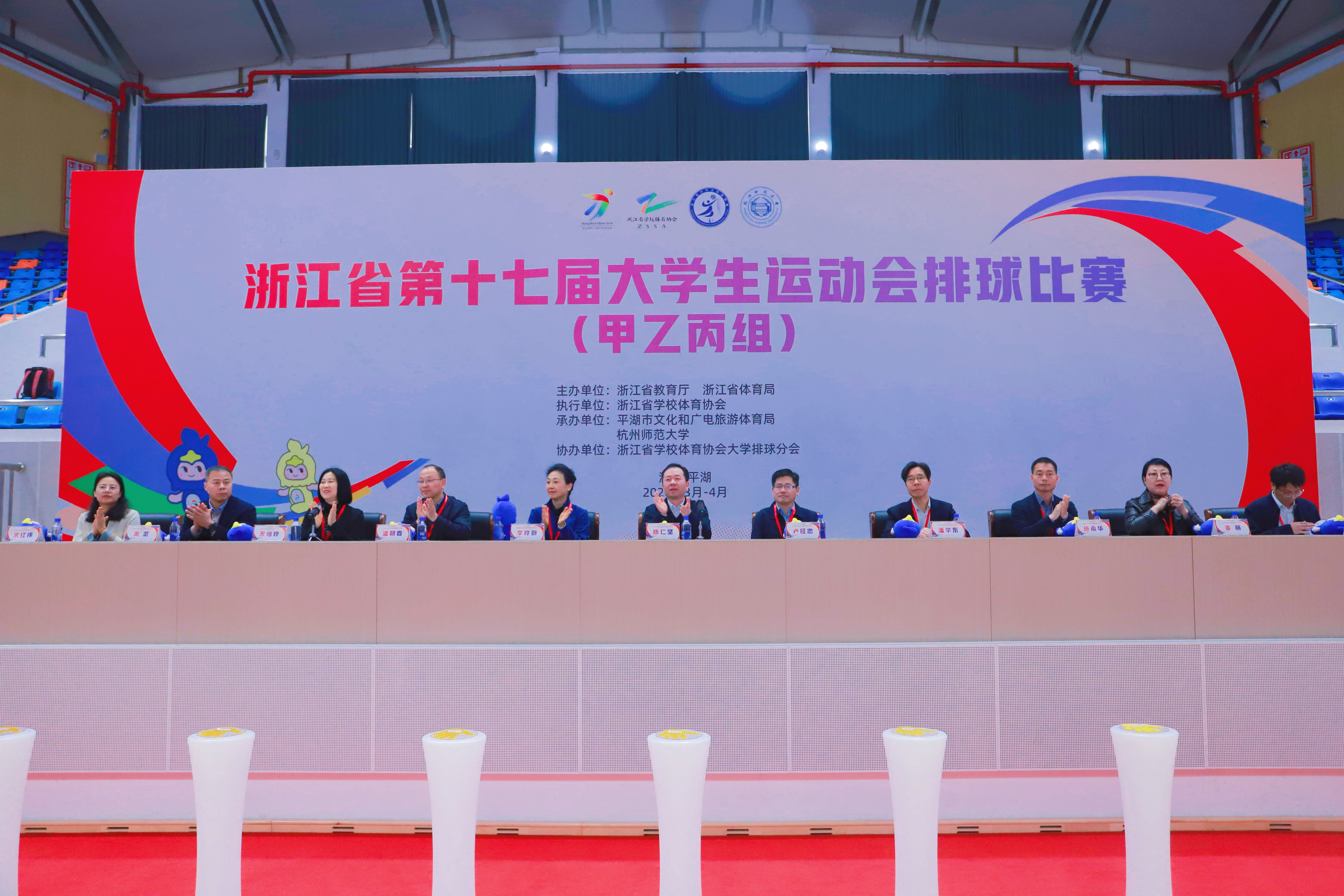 春潮涌动润江南,排坛逐梦启新程。3月31日上午,浙江省第十七届大学生运动会排球比赛开幕式在嘉兴平湖市体育中心隆重举行。本次比赛由浙江省教育厅、浙江省体育局主办,杭州师范大学联合平湖市文化和广电旅游体育局共同承办。作为承办方之一,我院充分发挥体育学科优势与赛事组织经验,全程统筹协调、精心筹备,助力这场全省大学生排球盛会顺利启幕。