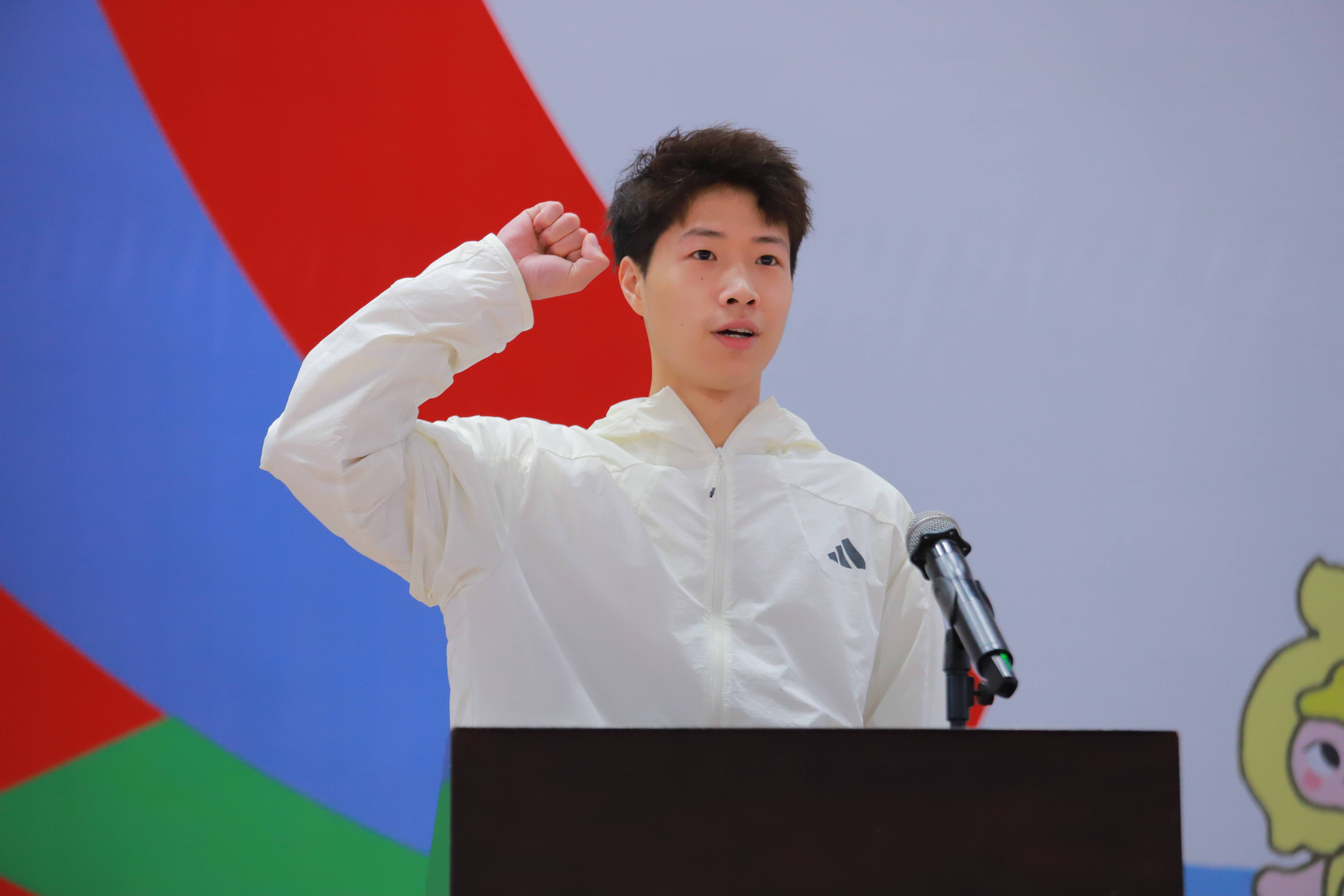 我院体教225班学生胡志豪(右)作为运动员代表宣誓,铿锵誓言响彻场馆,传递出公平竞赛、奋勇争先的坚定信念。